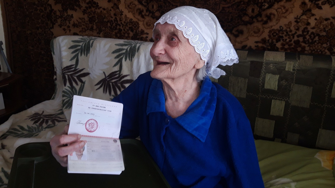 Сотрудники Управления по вопросам миграции ГУ МВД России по Ставропольскому краю в рамках проводимой работы по урегулированию правового статуса ветеранов Великой Отечественной войны установили, что на территории региона проживает 91-летняя женщина, прибывшая из Луганской области. Руководством краевого Главка было принято решение в кратчайшие сроки оформить необходимые документы и накануне празднования 75-й годовщины Победы вручить российский паспорт ветерану Великой Отечественной войны по месту жительства.