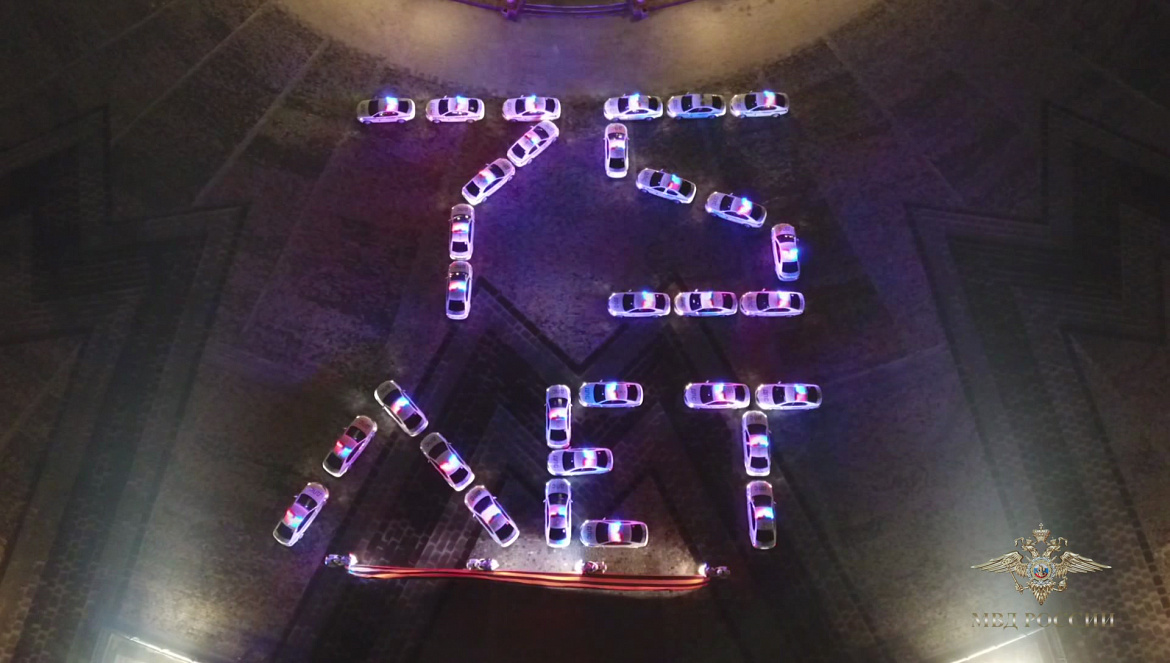 «9 мая почтить память участников войны и тружеников тыла в Парк Победы на Поклонной горе приехали полицейские. Возложив цветы к Вечному огню, наши сотрудники выстроили патрульные автомобили в виде цифры «75», а затем включили фары и проблесковые маяки, зажгли в руках фонарики.