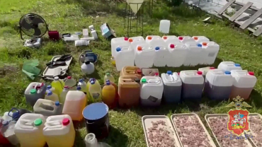 Изъяты подносы с N-метилэфедроном, колбы, различные ёмкости с прекурсорами, вакууматор, канистры с химическими жидкостями, электронные весы, респираторы и оборудование.