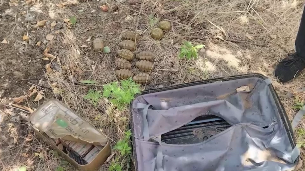 В результате проверки домовладения местного жителя в огороде на приусадебном участке был обнаружен чемодан с находившимися внутри 12-ю гранатами с запалами и цинковый короб с более чем 1000 патронами калибра 5.45.
