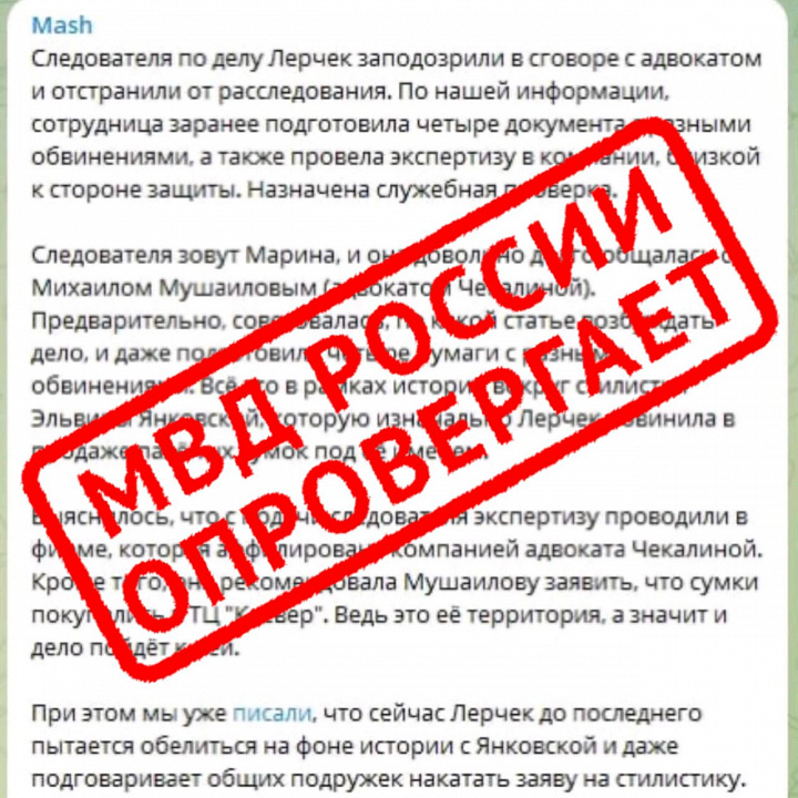 Сегодня в телеграм-канале «Маsh» размещена информация, что следователь, осуществляющая предварительное следствие по уголовному делу, возбужденному по ст. 159 УК РФ «Мошенничество», в котором фигурирует известная блогер, заподозрена в сговоре с адвокатом потерпевшей стороны и нарушила ряд процессуальных норм. Утверждалось, что сейчас следователь отстранена от расследования и в отношении нее проводится служебная проверка.