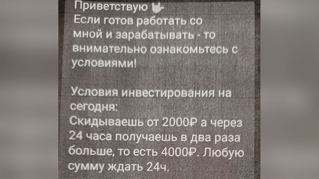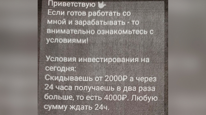 В дежурную часть полиции обратились несколько жителей г. Железногорска, которые заявили, что стали жертвами обмана. Установлено, что все преступления совершены по одинаковой схеме: заявители, увидев в популярной социальной сети объявление о лёгком способе быстрого заработка, вступали в диалог с неизвестным, который якобы получал прибыль от инвестирования денежных средств в различные проекты.