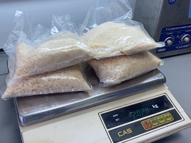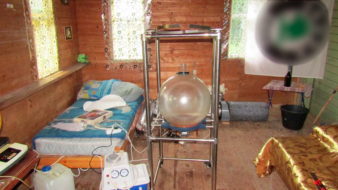 Сотрудниками полиции в ходе обыска изъяты стеклянные колбы, термометры, сепаратор, ёмкости с прекурсорами, противогаз, перчатки и приготовленное вещество. Согласно заключению эксперта, изъятое является смесью, содержащей мефедрон, общей массой более 11 кг.