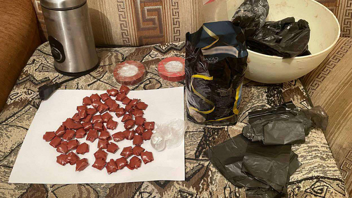 При проведении обыска в съёмном жилье обнаружен ещё 61 свёрток с героином, а также изолента, кофемолка, пластиковая миска, пакет с остатками вещества светлого цвета и пачка из-под сахара с наркотическим средством внутри.