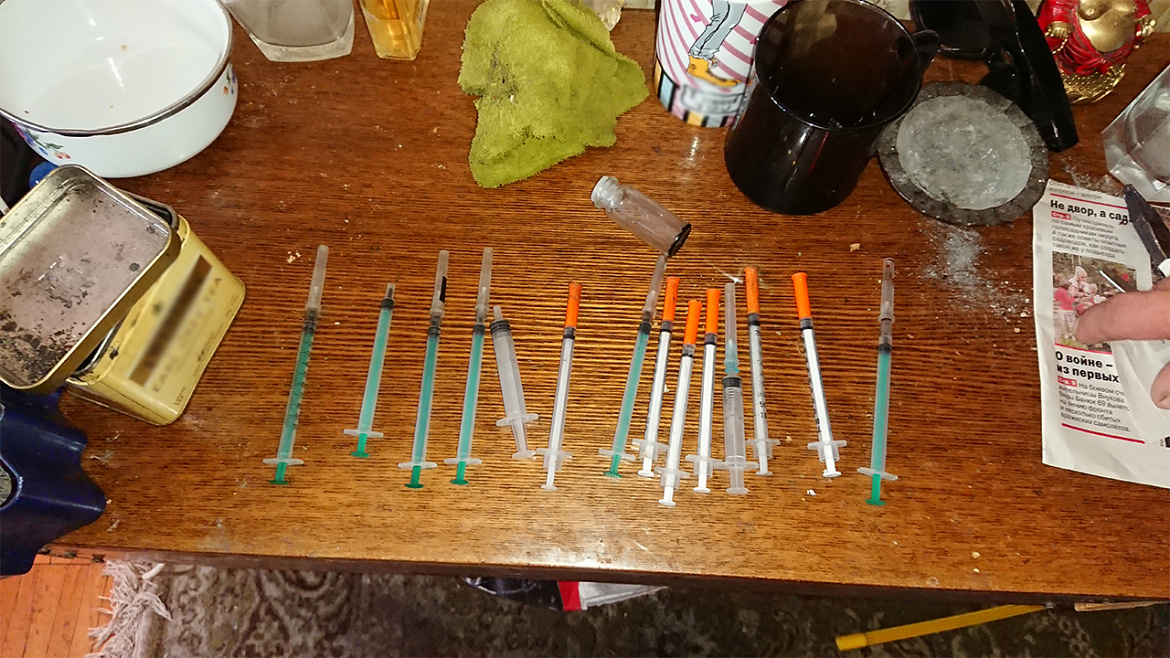При обследовании квартиры полицейские обнаружили и изъяли 14 шприцев со следами наркотического средства - героина, стеклянный флакон со следами нагара, а также иные предметы, используемые для потребления наркотиков.