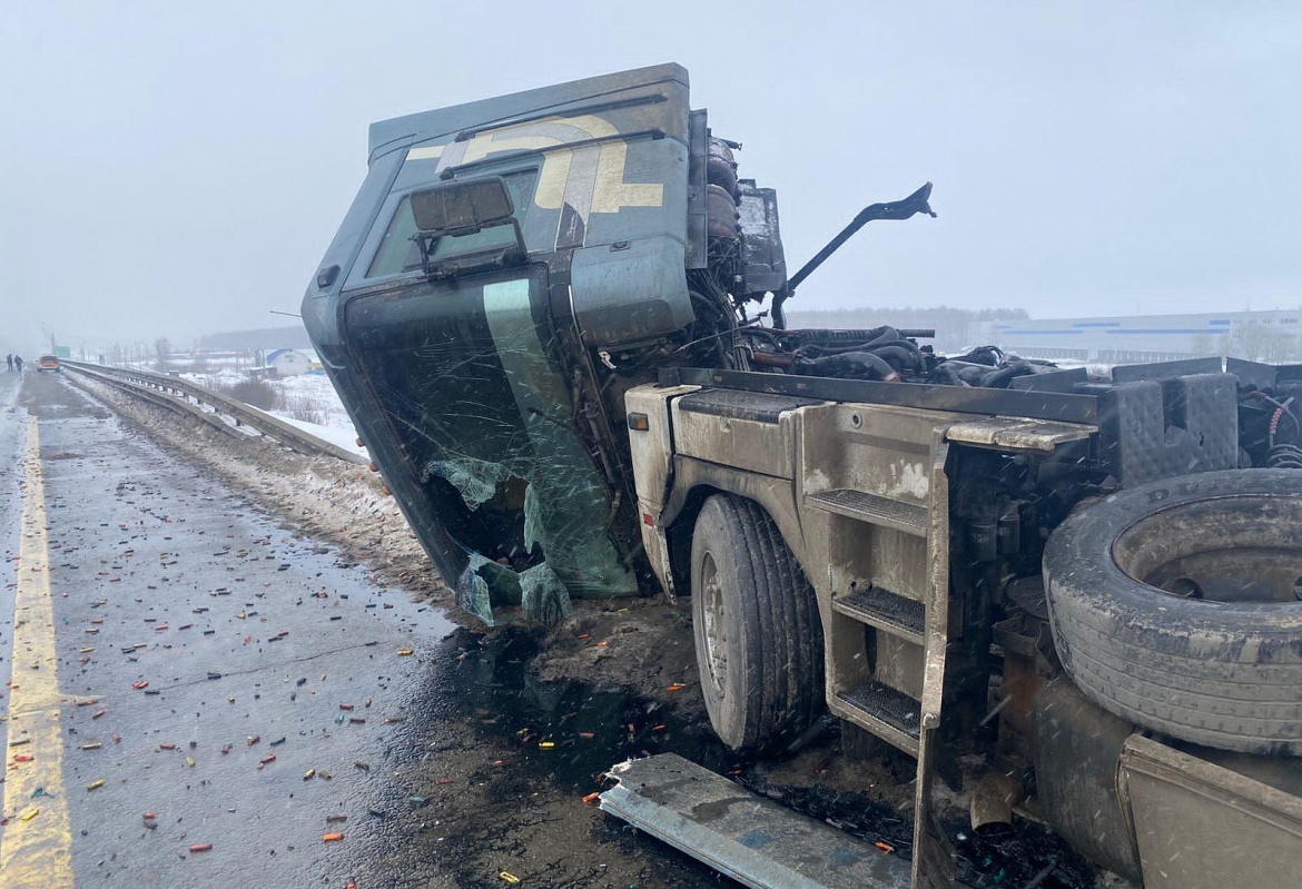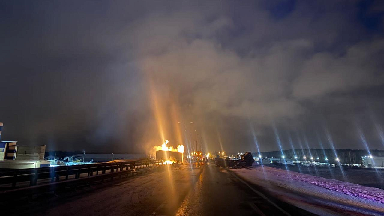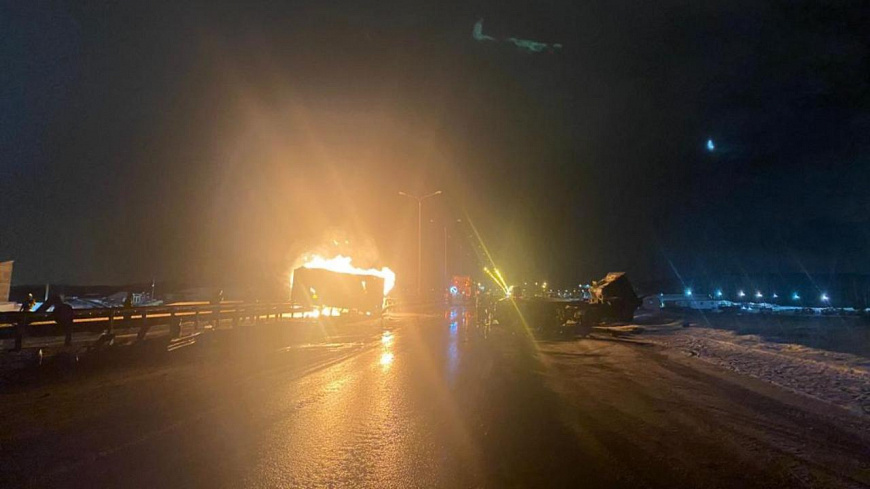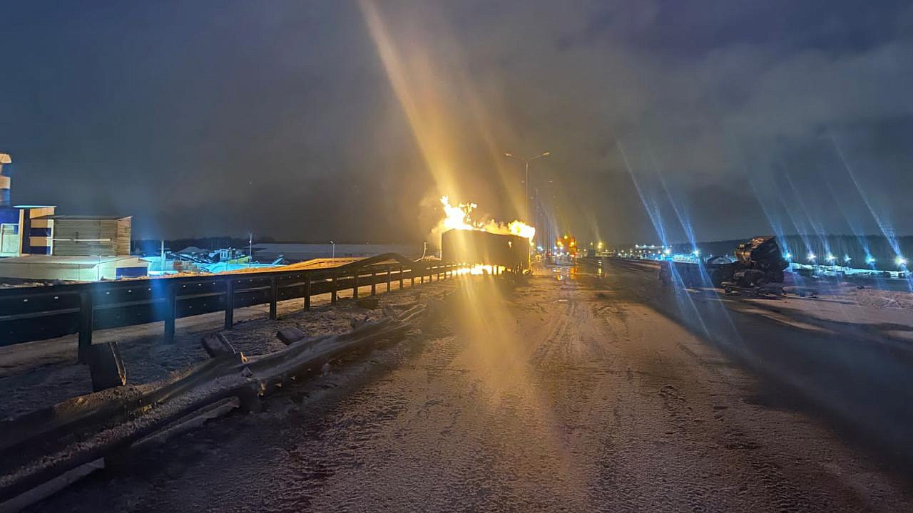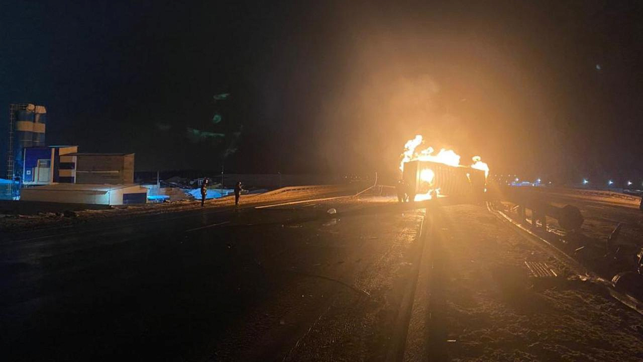 По предварительной информации, водитель грузового автомобиля с прицепом совершил наезд на металлическое ограждение. После чего трейлер, в котором находился легковоспламеняющийся груз, опрокинулся на дорогу, и произошло его возгорание. В результате аварии пострадавших нет. В настоящее время предпринимаются меры по локализации пожара.
