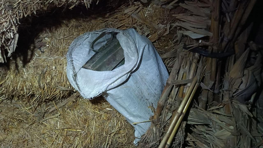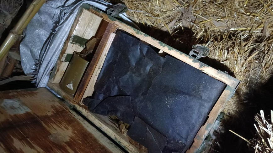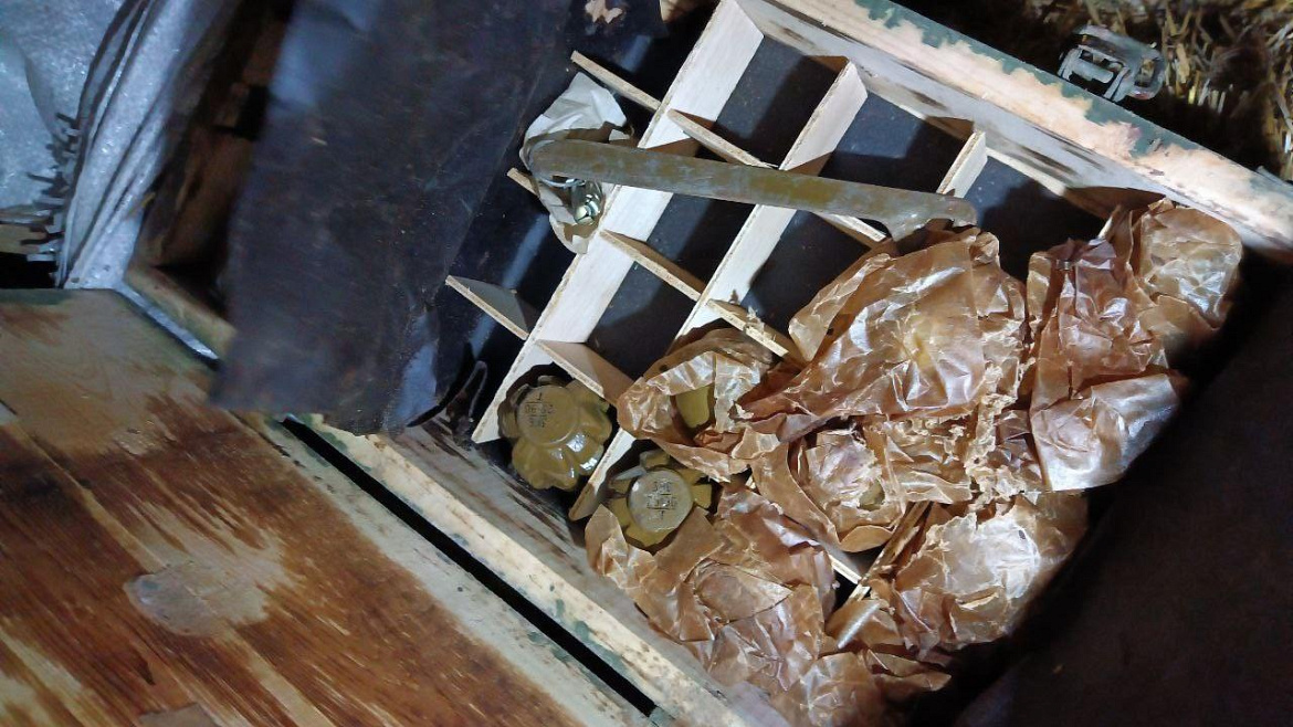 Там под слоем соломы находился деревянный ящик, в котором хранилось 11 запалов к ручному противотанковому гранатомёту, а также 9 гранат Ф-1 и одна граната РГД-5. Специалисты-взрывотехники установили, что боеприпасы пригодны для дальнейшего использования.