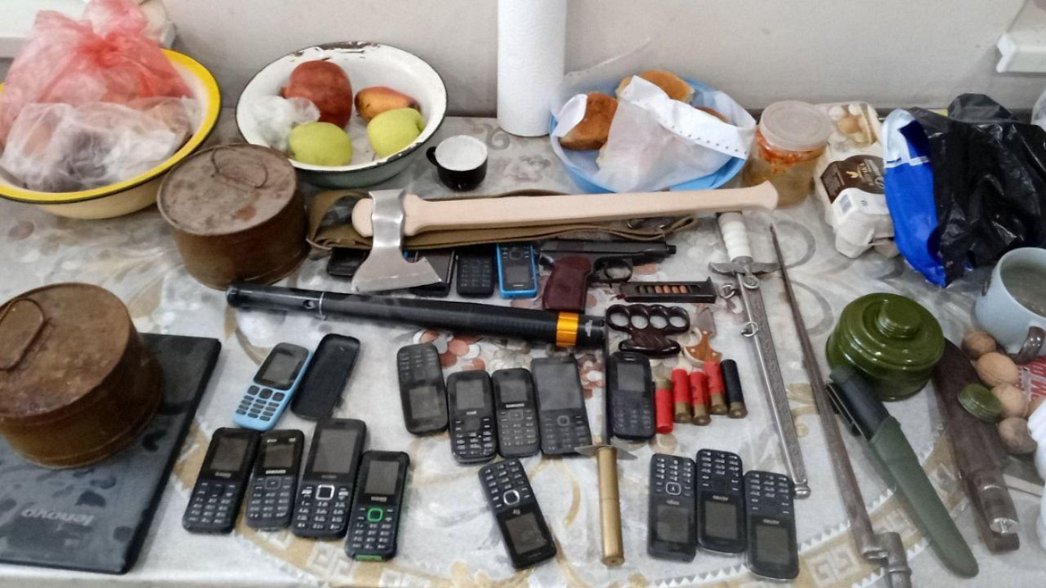 По месту жительства мужчины сотрудники полиции обнаружили и изъяли сигнальный огонь, 2 дымовые шашки, 5 охотничьих патронов 16 калибра, пластиковый кастет, пику, 126 травматических патронов калибра 9 мм, штык-нож и два охотничьих ножа, муляж германского пистолета-пулемёта времён Великой Отечественной войны МР-40, обрез охотничьего ружья 16 калибра, а также пистолет Макарова со стволом, переделанным для установки глушителя, германскую каску и кортик с нацистской символикой.