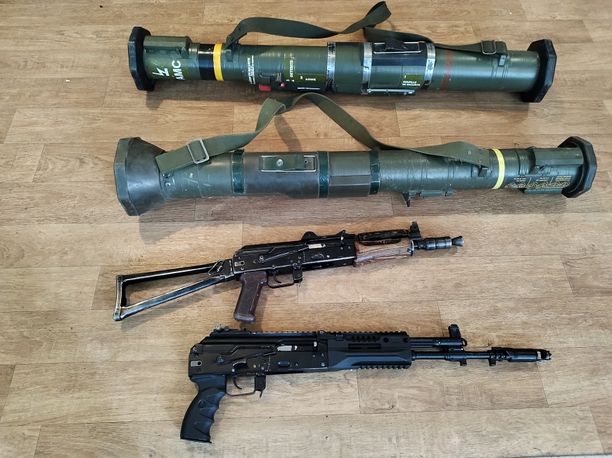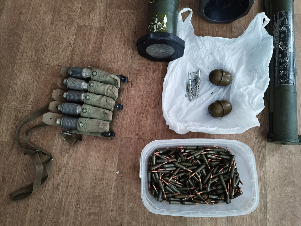 В результате полицейские обнаружили и изъяли три ручных гранатомёта, два из которых иностранного производства, две гранаты РГД-5, два автомата Калашникова, пять выстрелов к подствольному гранатомёту ГП-25 и 320 патронов калибра 5,45.