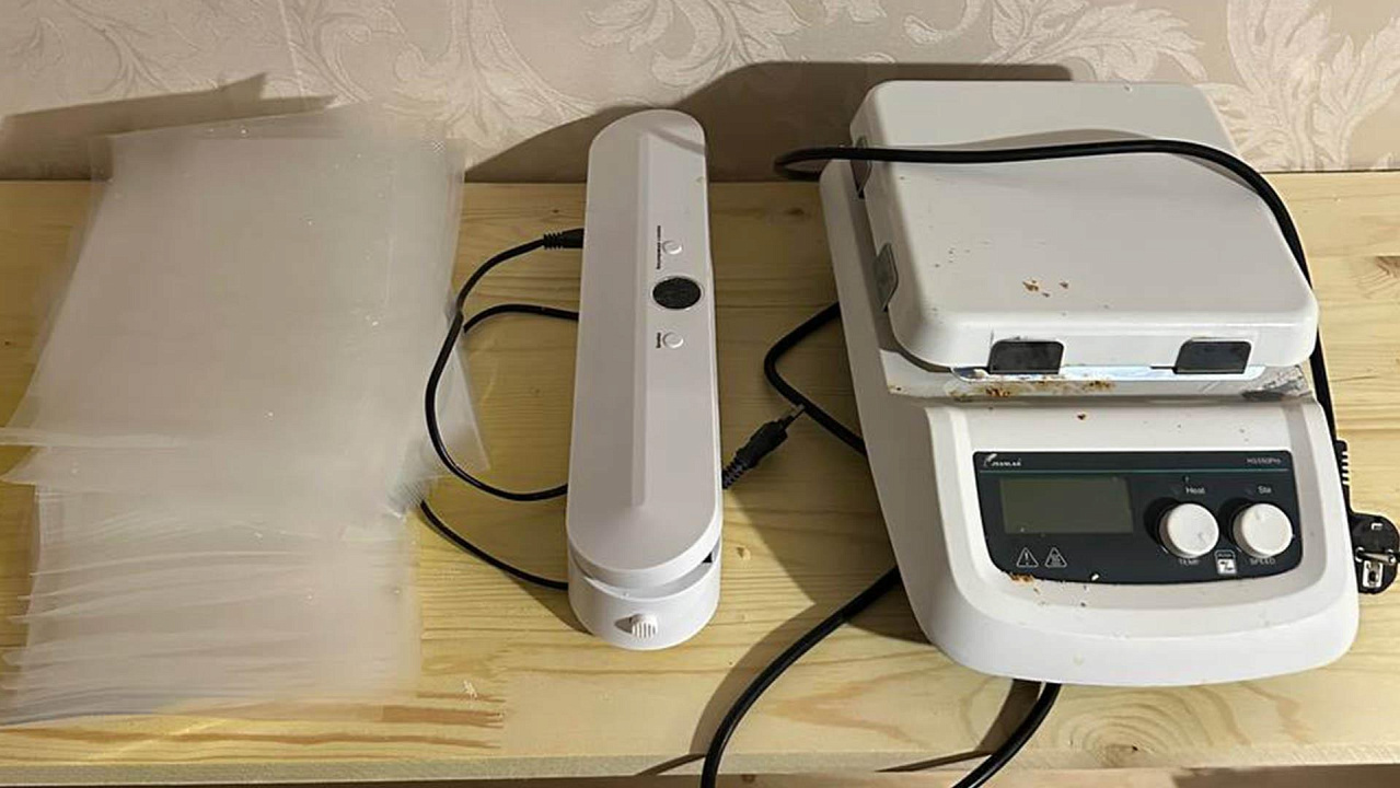 Кроме того, сыщики также обнаружили в доме стеклянные колбы, электронные мешалки и весы, керамические воронки, индукционную плитку, вакууматор, противогазы и иные предметы для производства смертоносного зелья.