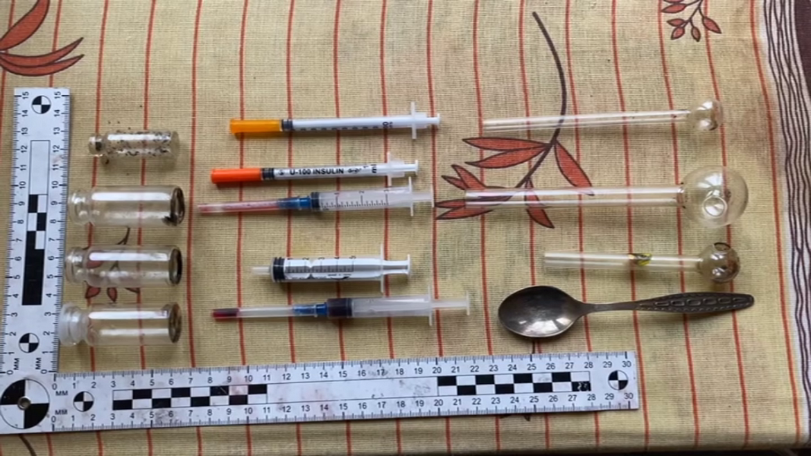 При обследовании квартиры подозреваемого было изъято 5 шприцев, а также различные приспособления и предметы для употребления наркотиков, на которых, согласно справке об исследовании, найдены следы N-метилэфедрона.
