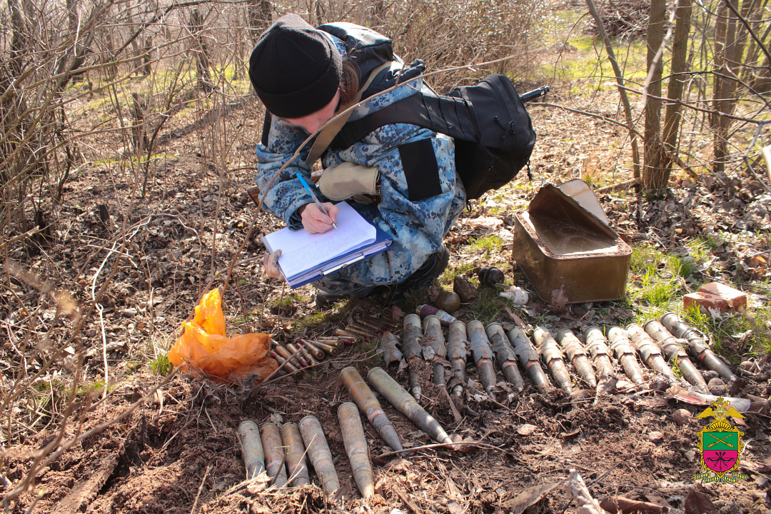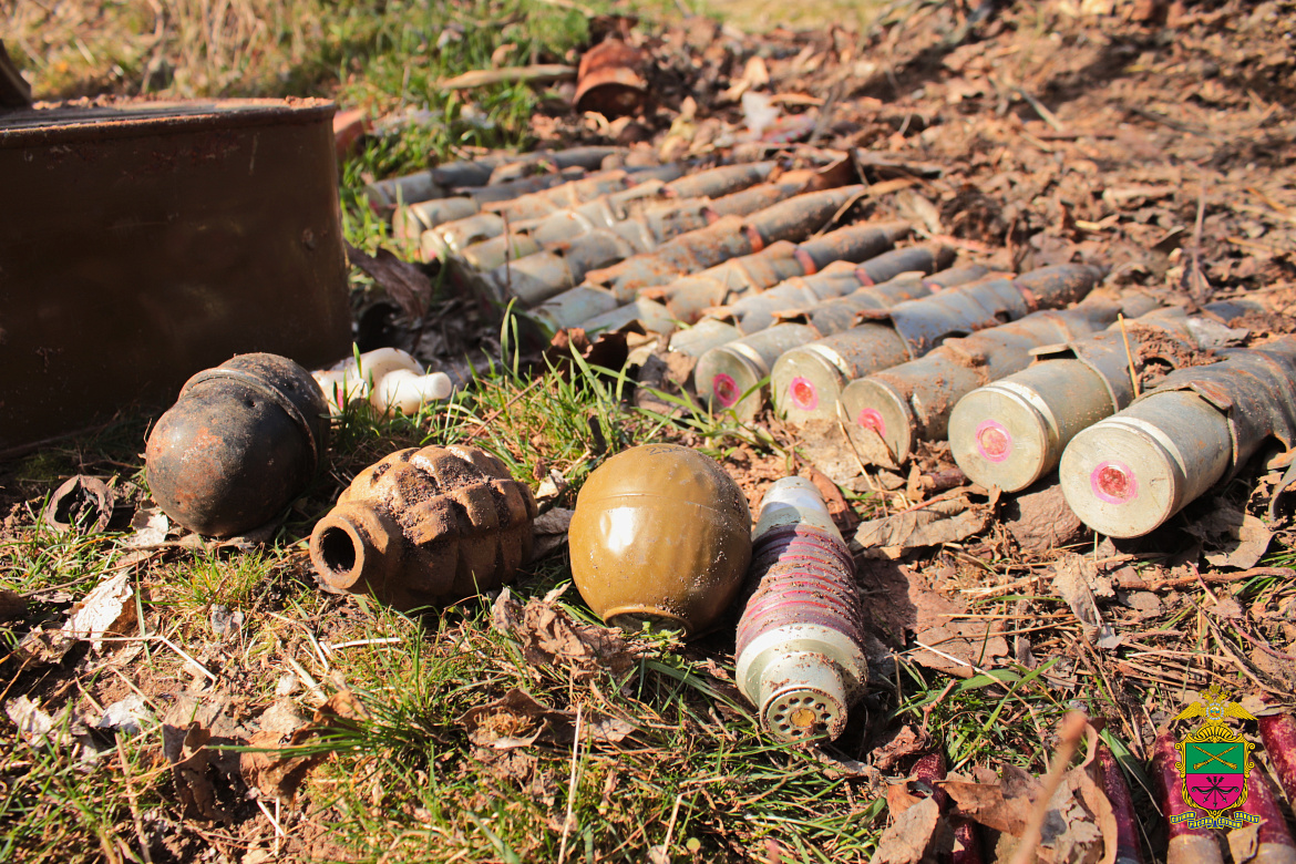 При обследовании местности с применением кинологических расчетов были обнаружены и изъяты 20 осколочно-фугасных снарядов, 3 ручные гранаты (Ф-1, РГД-5 и РГН-1) и 3 дымовые (3Д6 калибра 81 мм), выстрел для гранатомёта, 2 тротиловые шашки, а также патроны для крупнокалиберного пулемёта.