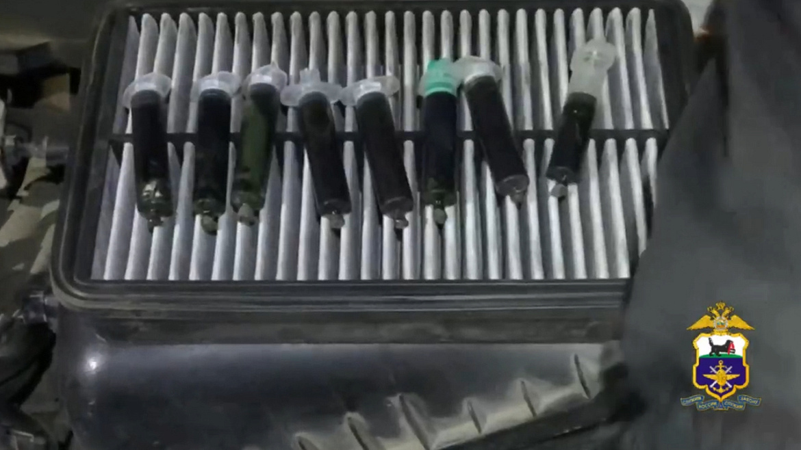При обследовании машины служебная собака сигнальной позой обозначила возможное наличие под капотом запрещённых веществ. Стражи правопорядка обнаружили спрятанный в воздуховоде транспортного средства полимерный пакет с 11 шприцами с тёмным веществом.