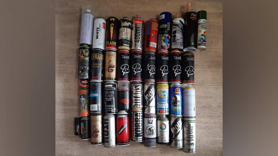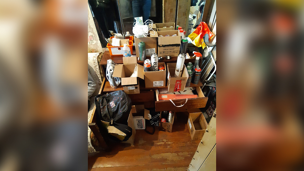 В квартире граффитиста полицейские обнаружили и изъяли телефон и ноутбук, содержащие изобличающие его противоправную деятельность фотографии и видеозаписи, 100 аэрозольных баллончиков с краской, а также испачканные в краске одежду и сумки.