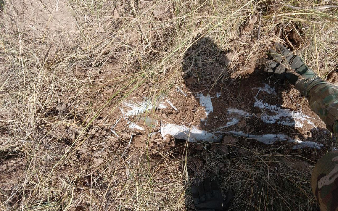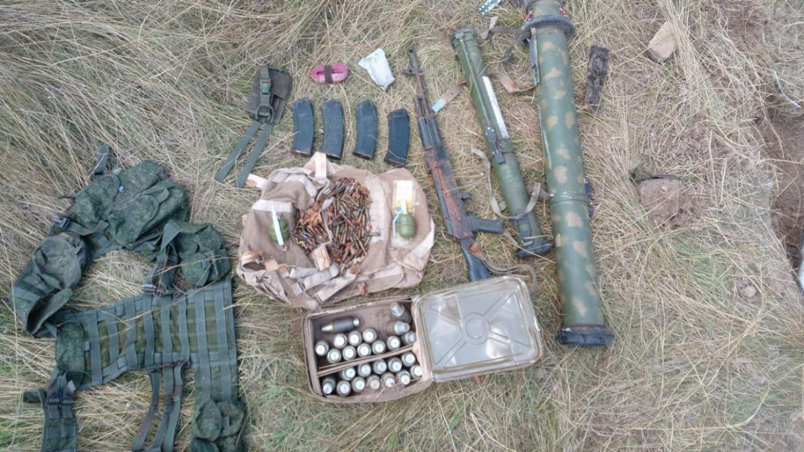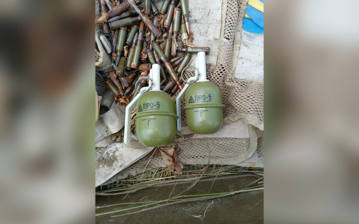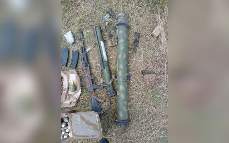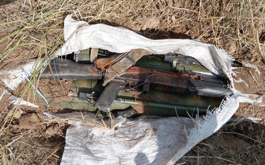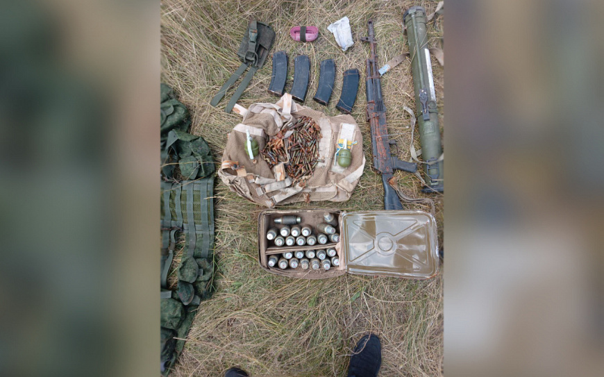 На расстоянии 600 метров от указанного населённого пункта правоохранители обнаружили оборудованный тайник. В поле среди зарослей травы был зарыт белый мешок с 25 гранатами ВОГ-25П, двумя гранатомётами РПГ-26 и РШГ-1, двумя гранатами РГД-5, автоматом АК-74М с четырьмя магазинами к нему, также внутри находились 348 патронов калибра 5,45 мм, одна армейская разгрузка и одна пластина «промедола».