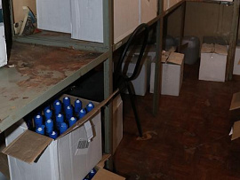 Полицейские обнаружили там 84 коробки, в которых хранилось 336 пятилитровых пластиковых бутылок со спиртосодержащей жидкостью. Часть из них была оклеена этикетками одного известного производителя водки, однако федеральные специальные марки на таре отсутствовали. Остальные ёмкости и вовсе не имели каких-либо обозначений о происхождении их содержимого. Вместе с этим 24 канистры были наполнены раствором красного цвета.