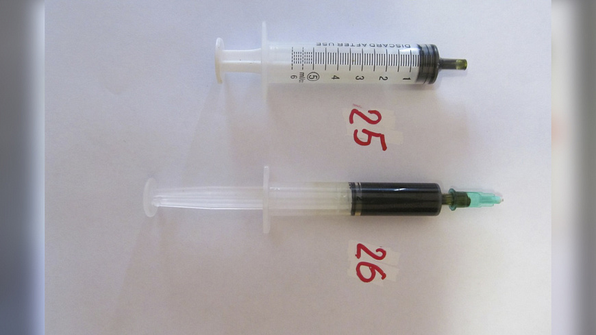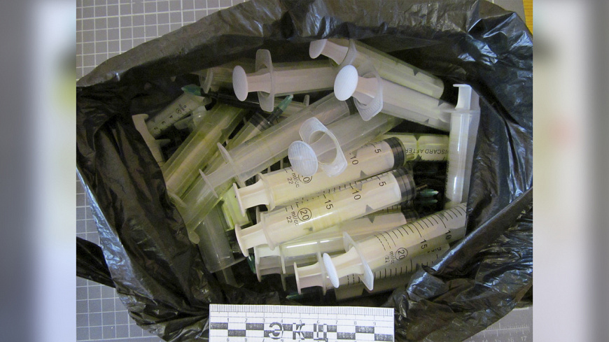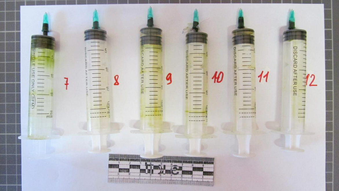 В ходе обыска по месту жительства и в гараже обвиняемого стражи правопорядка обнаружили и изъяли два полимерных пакета чёрного цвета и 26 шприцов с веществом зелёного цвета, а также растительную массу, схожую с наркотическим средством. Согласно заключению эксперта, изъятое является маслом каннабиса и марихуаной.