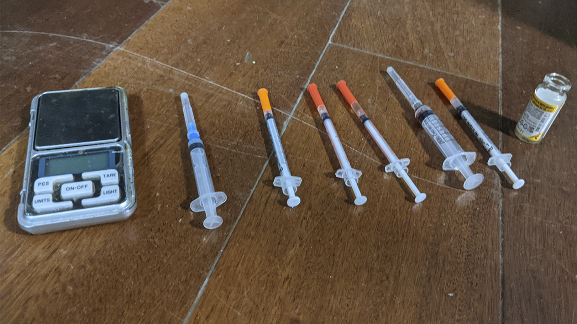 При обследовании помещения полицейские обнаружили и изъяли электронные весы, стеклянный флакон со следами нагара, шприцы с остатками вещества, а также другие предметы, используемые для употребления смертоносного зелья.