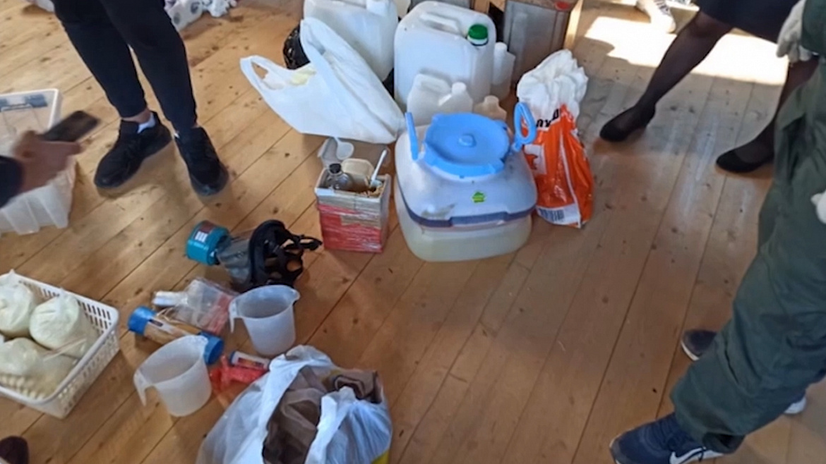 Подозреваемые задержаны. При обследовании участка полицейские обнаружили 12 канистр объёмом по 20 литров каждая с химическими компонентами, стеклянные колбы, лабораторную посуду, фильтры, маски-респираторы, перчатки, средства химической защиты, измерительные приборы и упаковочные материалы, использовавшиеся при изготовлении наркотиков. Кроме того, были изъяты изготовленные фигурантами запрещённые вещества, которые, согласно экспертизе, являются мефедроном общей массой около 460 грамм.