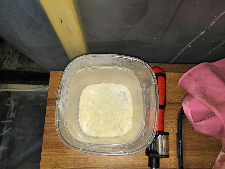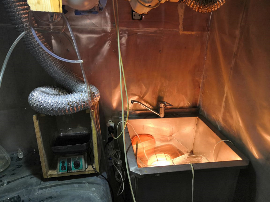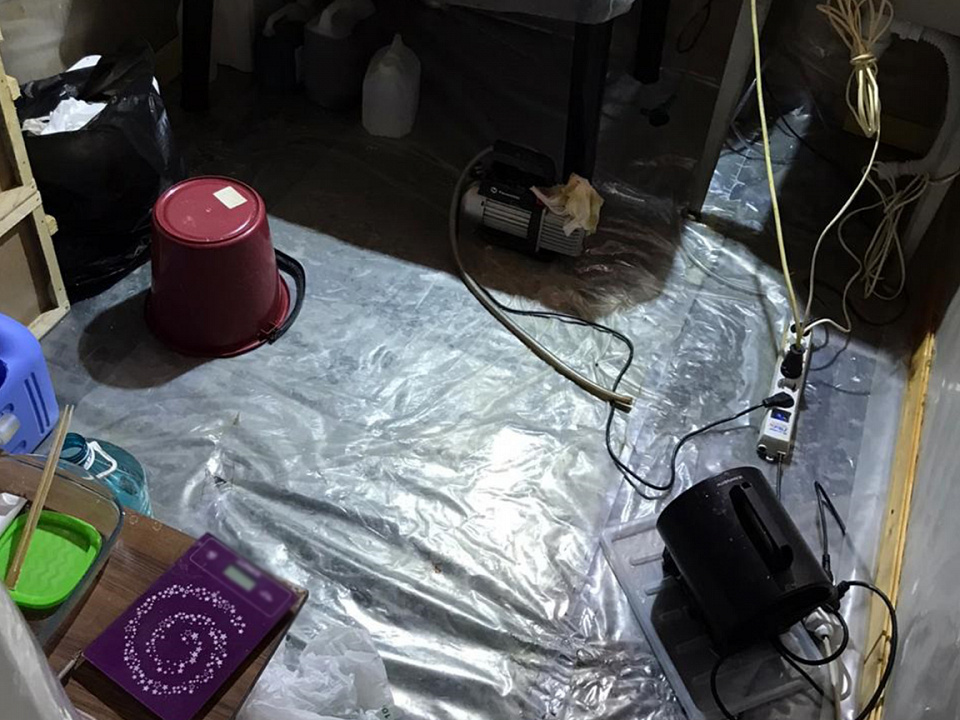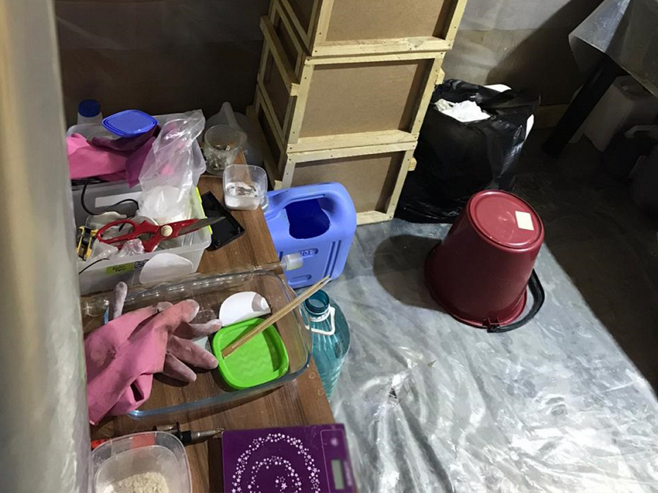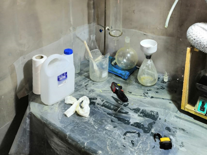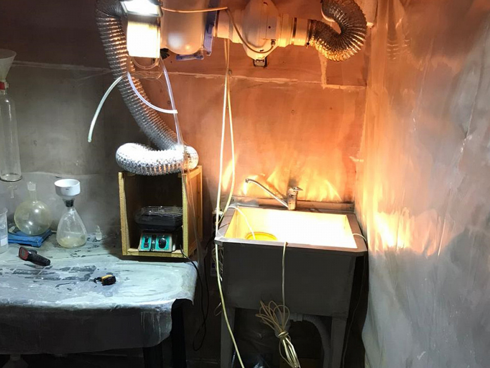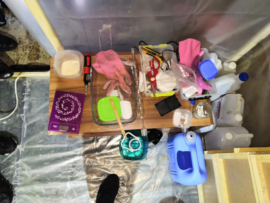 Во время осмотра малотоннажного автомобиля, припаркованного у места жительства мужчины, полицейские обнаружили и изъяли у задержанного канистры и контейнеры с ингредиентами и прекурсорами, предназначенными для изготовления наркотических средств, лабораторное оборудование, средства индивидуальной защиты, магнитную мешалку, электронные весы, упаковочный материал. Также сотрудники полиции изъяли наркотическое вещество синтетического происхождения. Согласно исследованию ЭКЦ содержимое является мефедроном массой более 500 граммов, что относится к крупному размеру.