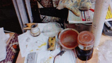 В гараже, принадлежащем подозреваемому, обнаружены растительный наркотик в 5 мешках, а также металлическая чашка, бутылки из-под растворителя, сигаретная упаковка и электрическая плита.