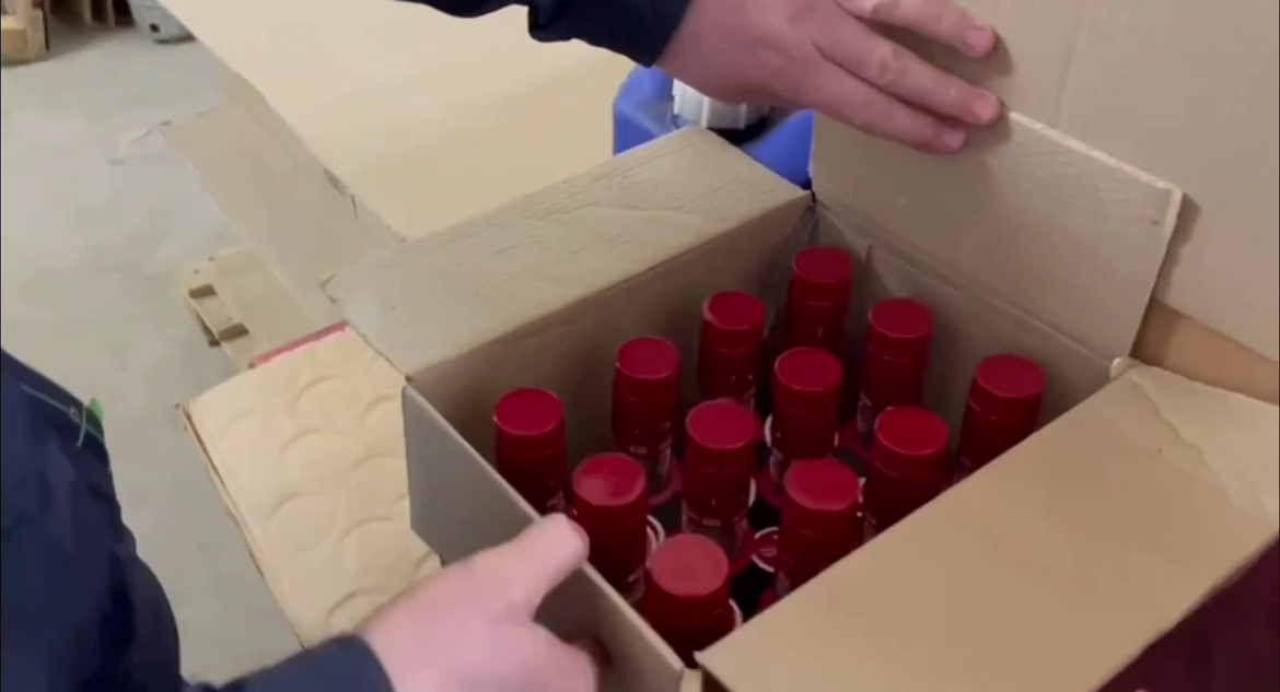 Полицейскими осмотрены помещения, из которых изъято производственное оборудование, стеклянная тара объемом 0,5 литра в количестве более 35 тысяч штук, свыше 15 тысяч крышек от бутылок, два рулона с имитацией акцизной марки Российской Федерации, готовая алкогольная и спиртосодержащая жидкость общим объемом более 12 тысяч литров и значительное количество других расходных материалов.