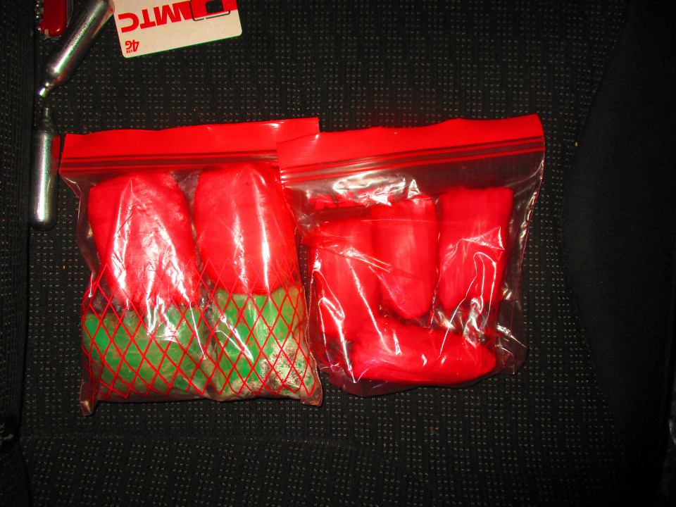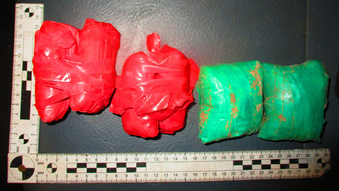 В присутствии понятых из рюкзака, лежащего на заднем сиденье автомобиля, было изъято 8 пакетов, обёрнутых красной и зелёной изолентой, с порошкообразным веществом внутри.