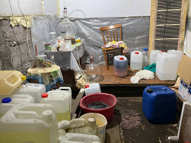 Во время обыска домовладения, в котором злоумышленник оборудовал нарколабораторию, полицейские нашли и изъяли порядка 212 г «синтетики», расфасованной на дозы, свыше 28 кг прекурсоров, фасовочные материалы, весы.