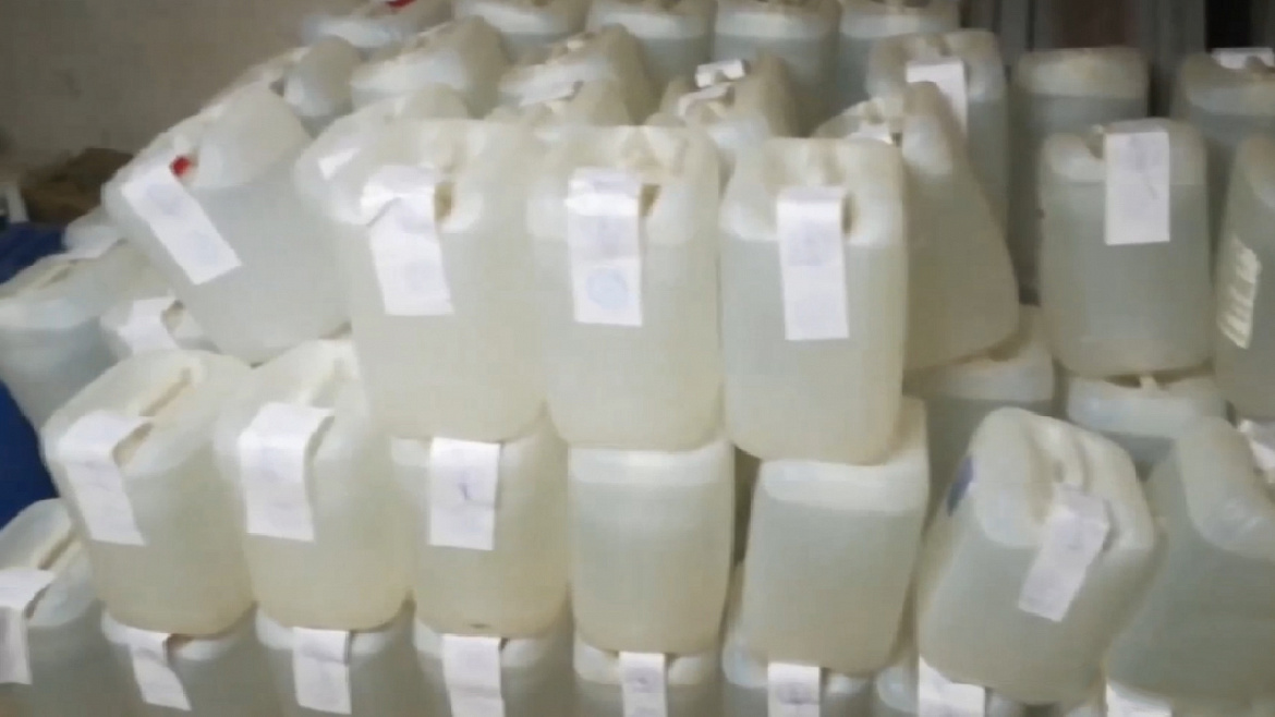 Во время обысковых мероприятий в доме злоумышленника изъято более 200 канистр и ёмкостей со спиртосодержащей жидкостью общим объёмом более двух тонн, а также свыше 800 бутылок готовой алкогольной продукции различных наименований.
