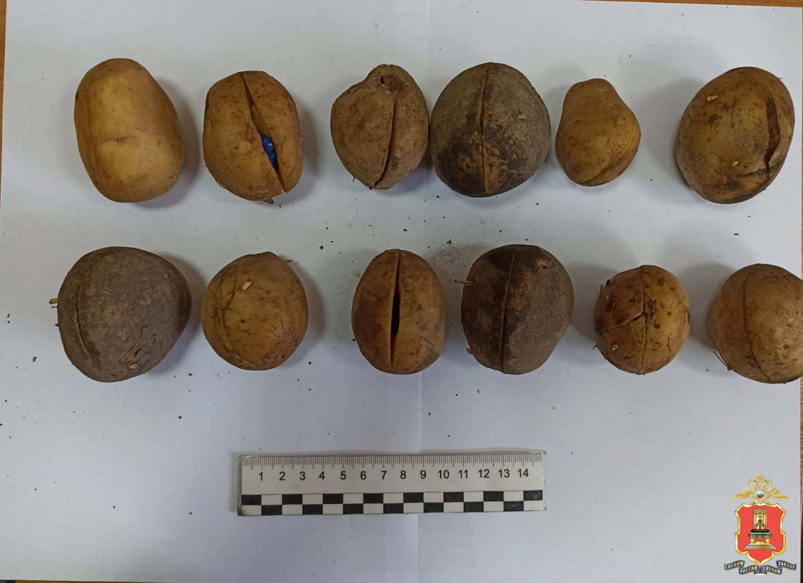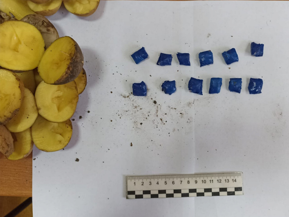 Оперативники обнаружили у задержанного полимерные свёртки и пакетики зип-лок с кристаллическим порошком. Кроме того, полицейские обнаружили и изъяли у подозреваемого жестяную банку из-под напитка и 14 картофелин, начинённых неизвестным веществом.