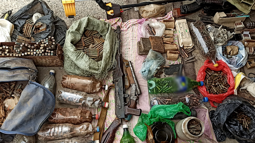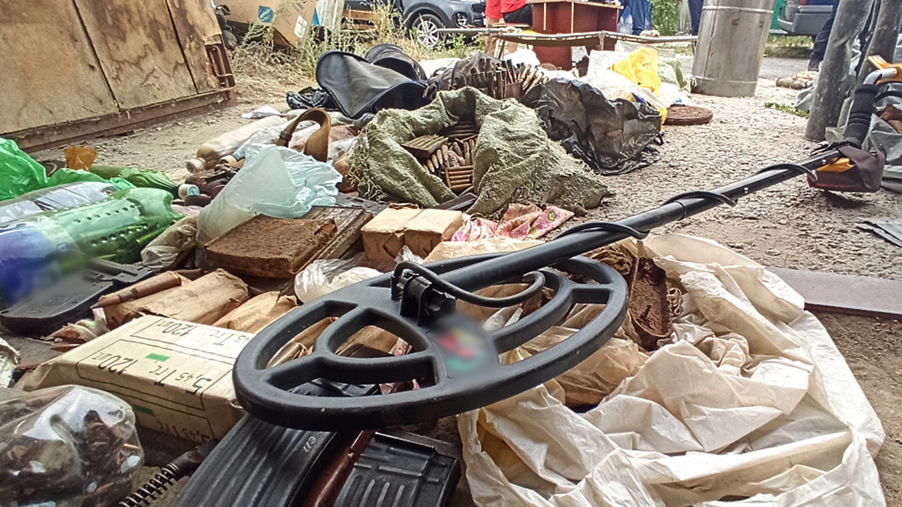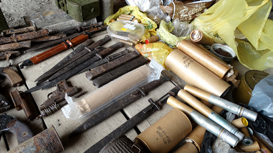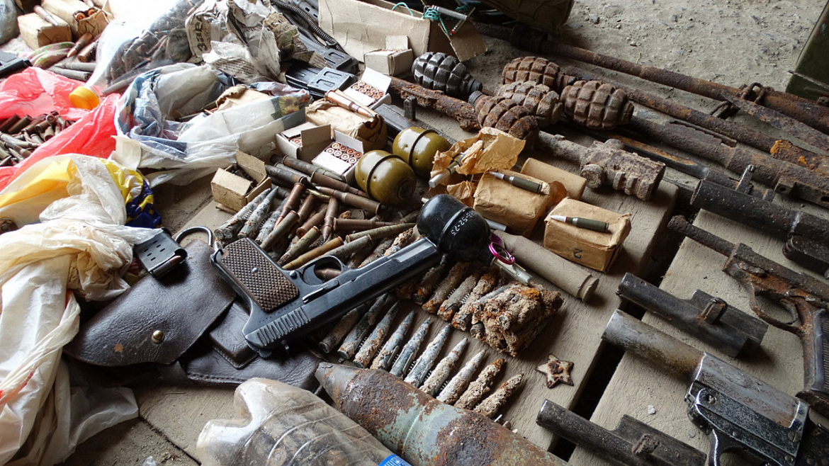Там было обнаружено несколько десятков предметов, конструктивно схожих с карабинами, винтовками Мосина, автоматами Калашникова, пистолетами-пулемётами ППШ, пистолетами Вальтер и ТТ, гранатами Ф-1, РГД-5. Изъято около пяти тысяч патронов различного калибра, основные части оружия, осветительные ракеты и дымовые шашки, штык-ножи.