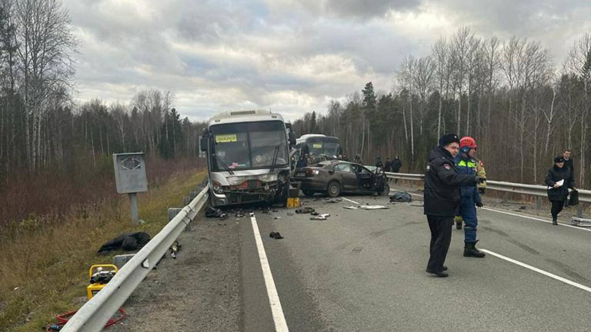 Предварительно установлено, что водитель машины Volkswagen Jetta на 68 километре автодороги «Югра» не справился с управлением и допустил выезд на полосу встречного движения, где столкнулся с автобусом марки Hyundai, в салоне которого находились 25 человек, включая водителя.