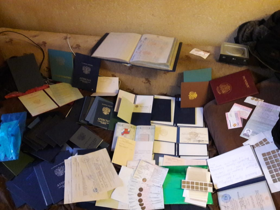 Блюстителями закона изъяты поддельные справки, печати, штампы и бланки различных организаций, бланки дипломов, аттестатов, сертификаты о владении русским языком, трудовые патенты, чеки об оплате госпошлин, а также мобильные устройства, банковские карты, электронные носители информации и документы, подтверждающие причастность членов группы к противоправной деятельности.