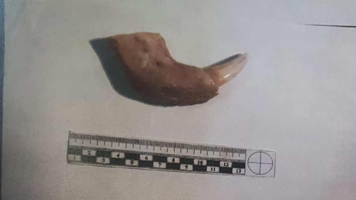При осмотре багажа мужчины был обнаружен и изъят фрагмент челюсти с клыком животного, принадлежащего к подвиду амурский тигр, а также часть желчного пузыря бурого медведя общим весом 125 граммов.
