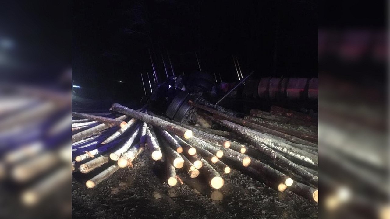 Экстренное торможение пришлось применить водителю лесовоза, который двигался за автопоездом. Однако транспортное средство вошло в неуправляемый занос, и водитель не смог совершить планируемый манёвр.