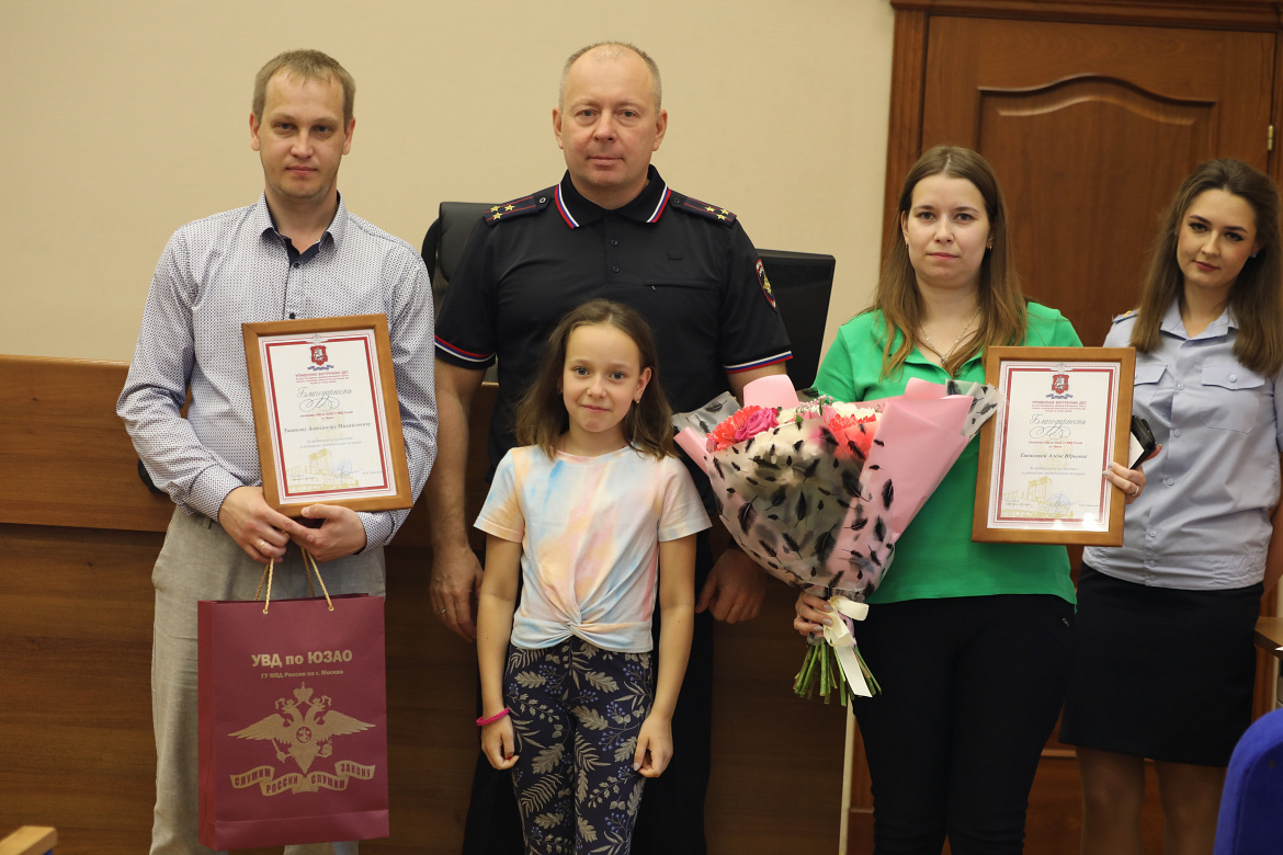 Позже в торжественной обстановке врио начальника УВД по ЮЗАО ГУ МВД России по г. Москве полковник внутренней службы Сергей Морозов вручил благодарности семье Тивиковых, Алёне и Александру, за проявленное мужество и активную гражданскую позицию. Героям передали памятные сувениры и подарки.