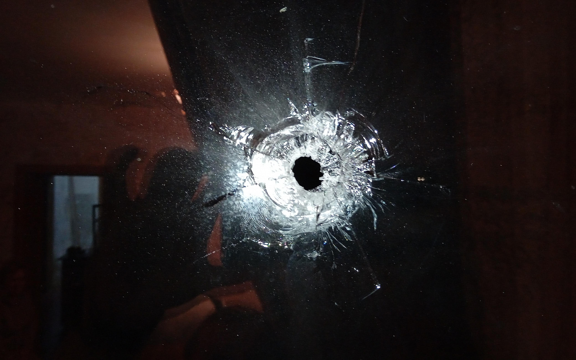 Прибывшие к ней сотрудники следственно-оперативной группы осмотрели место происшествия и обнаружили в стене металлический фрагмент, предположительно, пробивший стекло.