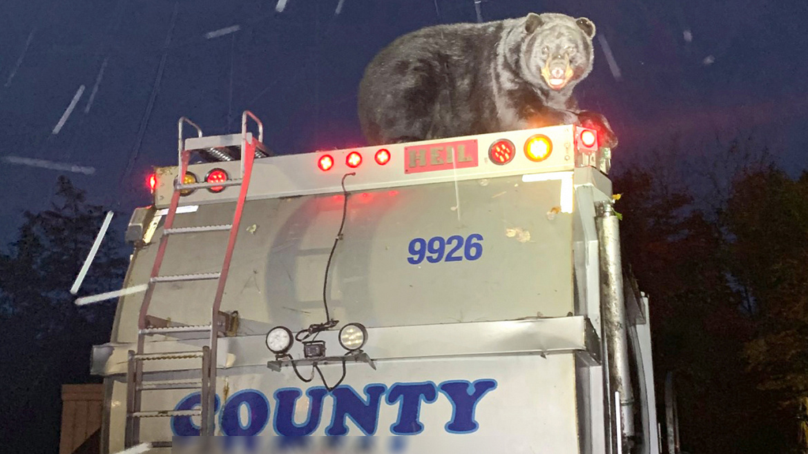 На этот раз от косолапого чуть было не пострадали сотрудники службы по уборке мусора. Проголодавшийся мишка, не обращая внимания на людей, влез на крышу спецавтомобиля и попытался забраться в кузов с отходами.