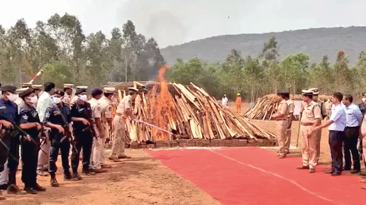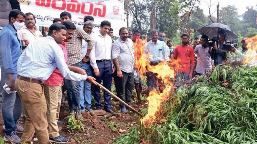 Полицейские индийского штата Андхра-Прадеш устроили церемонию сожжения более 200 тонн каннабиса, изъятого у местных племён в течение года.