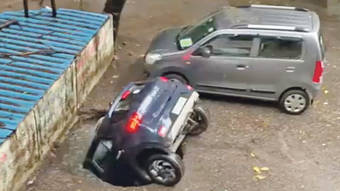 В индийском городе Мумбаи припаркованный автомобиль буквально исчез за несколько секунд. Машина провалилась в наполненную водой дыру, которая образовалась под его колёсами.