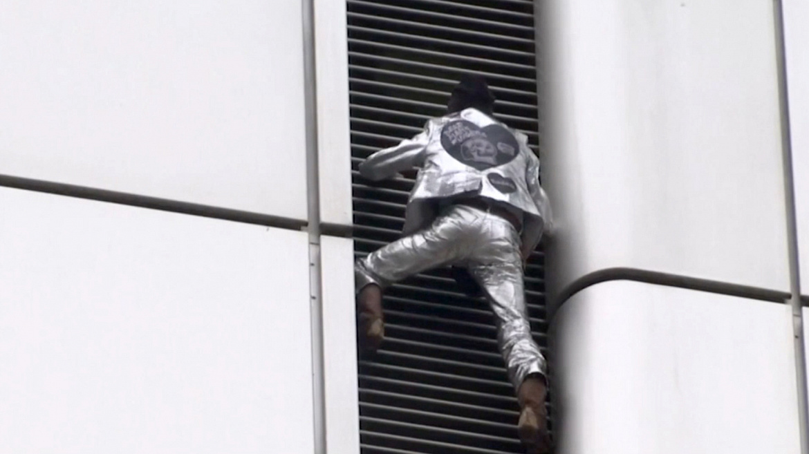 Супергероем оказался французский скалолаз Ален Робер. Без страховки и снаряжения он покоряет небоскрёбы по всему миру. В этот раз смельчак забрался на 166-метровое здание во Франкфурте-на-Майне.